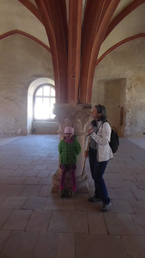 Wir nahmen Maß und die Kinder rannten an das andere Ende des Schlafsaals, wo sich Yve an die letzte Säule stellte und, man staune, der Abstand zwischen Kopf und Säulenrand war deutlich kleiner als an der ersten Säule. Sollte sie in der Kürze der Zeit etwa gewachsen sein? Wir rätselten woran es wo liegt, dass der Abstand nun deutlich geringer ist, zumal die Säulenumrandung augenscheinlich auf der gleichen Höhe liegt. Eine Hilfestellung ist das Kreuzgewölbe des Dormitoriums, das die Deckenlast trägt und sich über die gesamte Decke des Schlafsaals zieht. Aus diesem Grund musste der Fußboden entsprechend dem Gefälle des Untergrundes angepasst werden, d. h. er steigt von dem einen zum anderen Ende leicht an bzw. fällt leicht ab, je nach Blickrichtung des Besuchers.